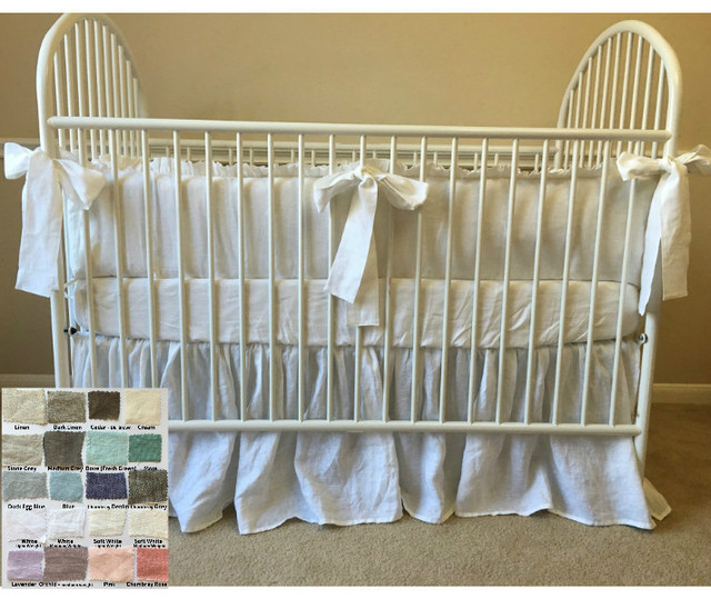 Crib Bedding Set With Ruffled Bumper Gathered Crib Skirt White Gray Blue Pink Stripe Chevron Over 40 Colors And Patterns